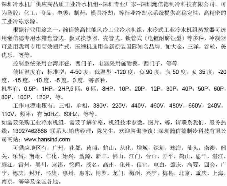 深圳低溫工業冷水機組哪個品牌好,深圳哪里有好的供應商,推薦【深圳低溫工業冷水機組供應商首先深圳瀚信德制冷】,低溫冷水機組多少錢一臺,請咨詢深圳瀚信德制冷,深圳瀚信德制冷是一家專業致力于低溫制冷機組,低溫工業冷水機組,低溫冷凍機組,研發,生產,銷售,安裝,維護,配件供應為一體的綜合性服務的制冷設備生產廠家,瀚信德制冷只銷售高端品質工業冷水機組,所以是一種優質品牌工業冷水機組。